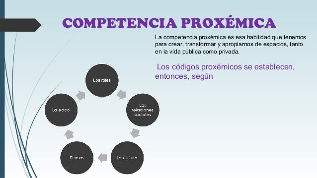 Esta competencia consiste en la capacidad que tenemos los hablantes para manejar el espacio y las distancias interpersonales en los actos comunicativos. Las distancias entre los interlocutores, la posibilidad de tocarse, el estar separados o en contacto, tienen significados que varían de una cultura a otra. Los códigos proxémicos se establecen, entonces, según la cultura, las relaciones sociales, los roles, el sexo, la edad. La competencia proxémica es esa habilidad que tenemos para crear, transformar y apropiarnos de espacios, tanto en la vida pública como privada.